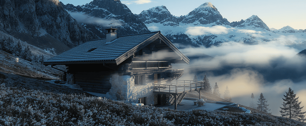 Alpine homes feature steeply pitched roofs, often with overhanging eaves designed to withstand heavy snowfall. Large, open spaces are paired with cozy nooks and fireplaces, making it the perfect retreat from harsh mountain weather.