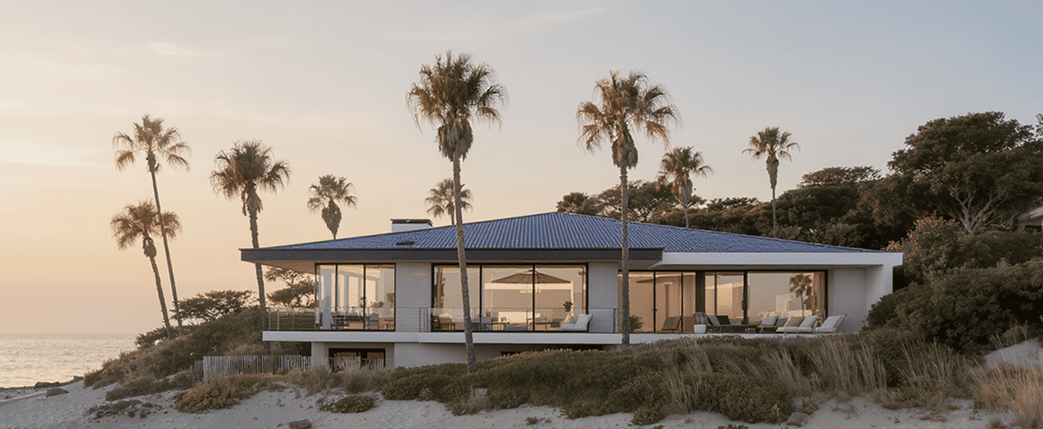 Open floor plans with expansive windows to invite the outdoors inside, often featuring sloped or gabled roofs to reflect the breezy, casual vibe of coastal living.